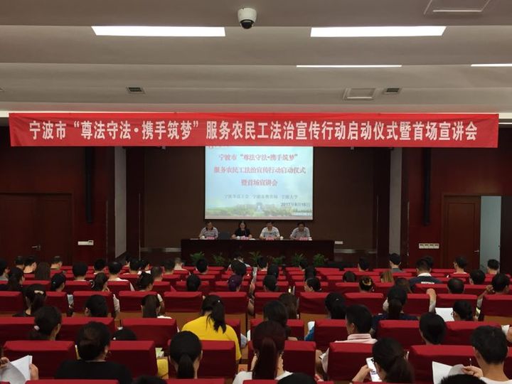 8月15日,宁波市总工会联合市教育局、宁波大学启动了“尊法守法•携手筑梦”服务农民工法治宣传行动,总工会将与宁波大学组织5个服务分队,分别由我院粟瑜、杜寅、马俊彦、郭兵、封红梅老师担任队长组及相关专业师生组成,按照“工会干部+高校师生”的组队形式,深入农民工群体开展宣传教育活动。