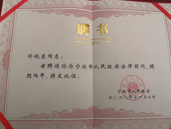 2020年11月4日,在宁波市行政会议中心召开宁波市法治政府建设暨综合行政执法改革推进会,市司法局励健局长、市城管执法局郑一平局长就法治政府建设和综合行政执法改革作发言。市长裘东耀、常务副市长陈仲朝、市政府秘书长朱金茂为新一届市政府法律顾问颁发聘书,我院钭晓东院长、潘申明副教授获聘宁波市政府法律顾问,市长裘东耀作讲话,市政府各部门一把手出席会议。